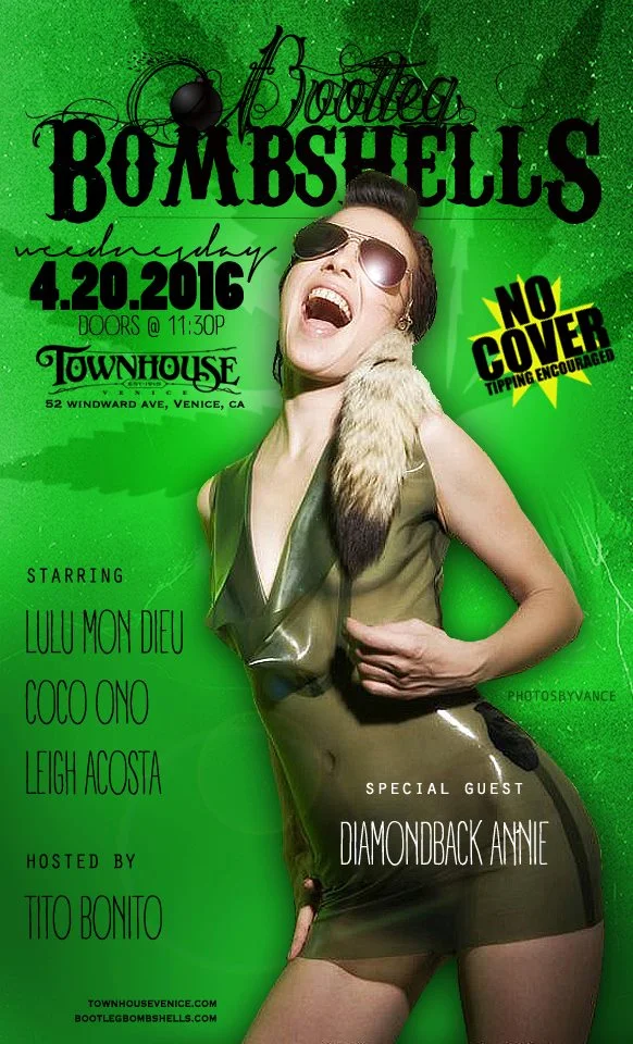 Annie appears as special guest of Venice burlesque troupe the Bootleg Bombshells at this 420 edition of their monthly show. FREE admission; 21+; show begins late, with door at 1130 pm. Hosted by the Cuban Missile Crisis, Tito Bonito, and featuring Coco Ono; pole goddess Leigh Acosta; and Lulu Mon Dieu.